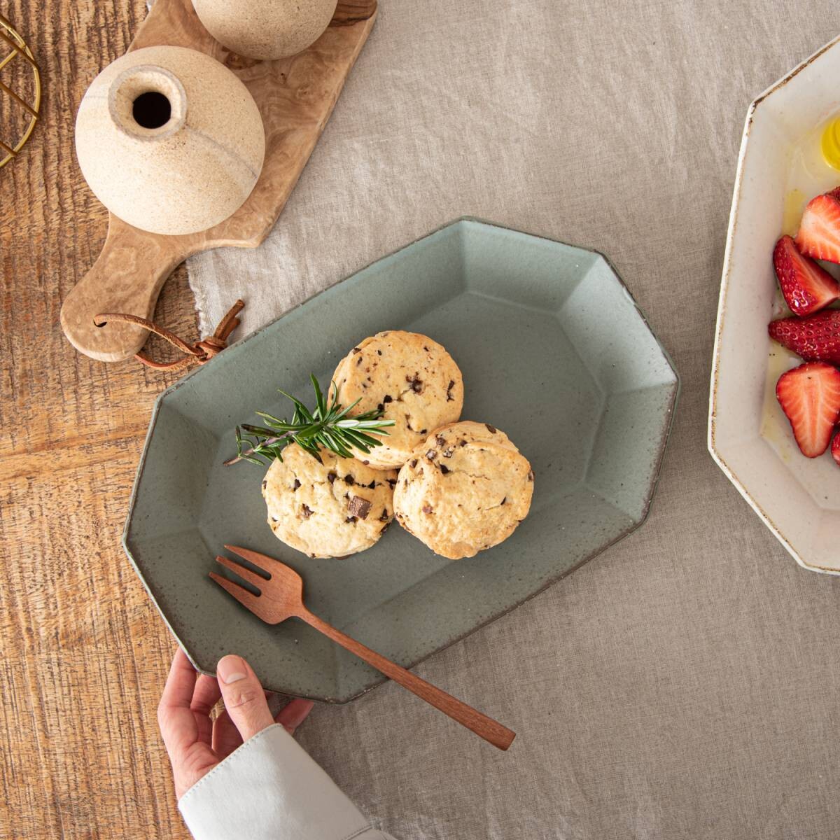 The shape is unique and easy to use. It has a wide range of usage, from side dish plate to serving bakery to salad plate. The plate also looks good when stacked.
